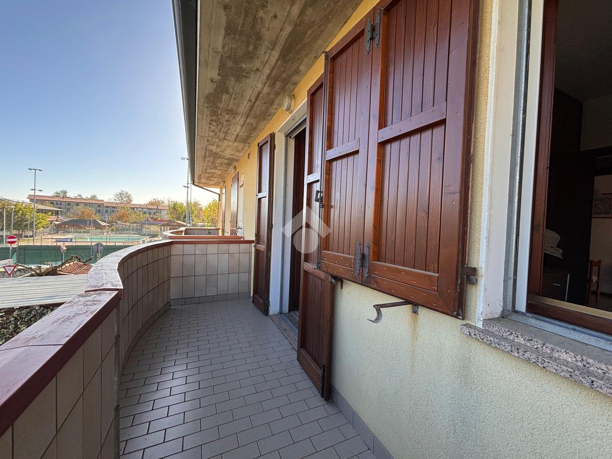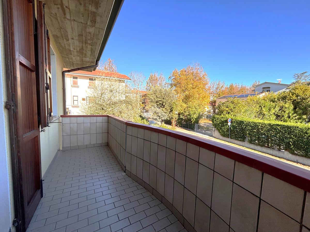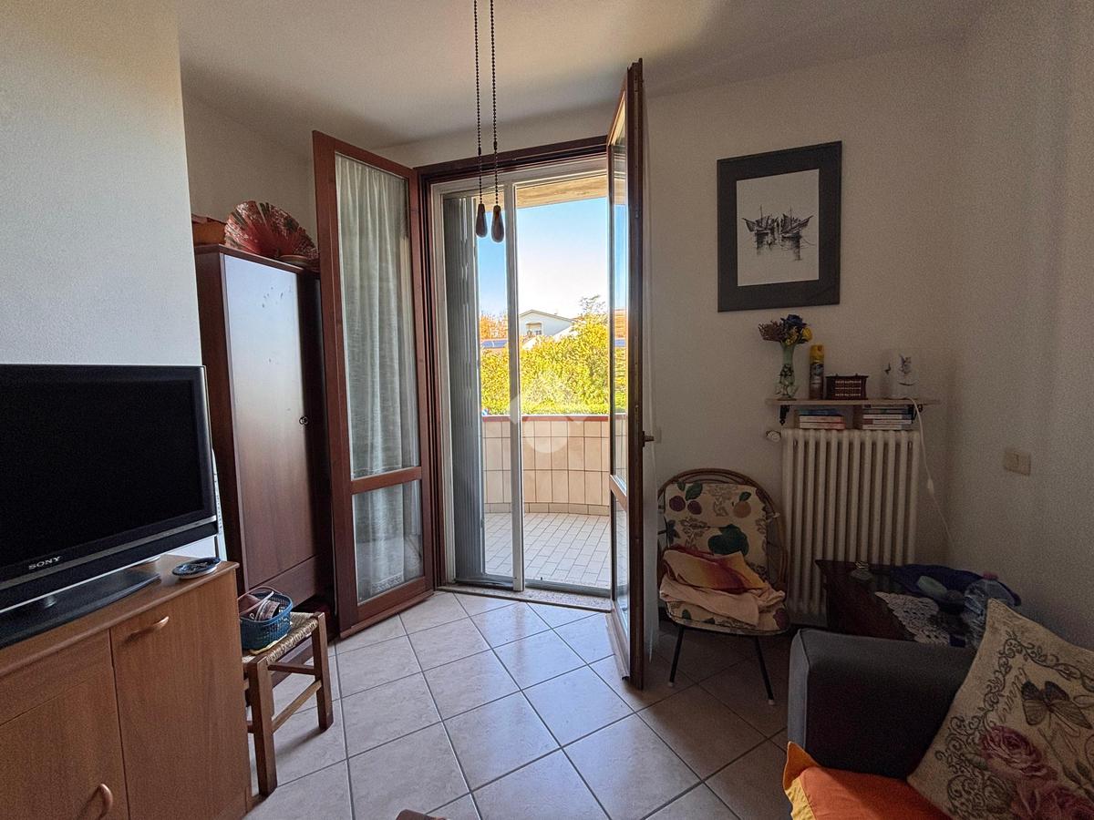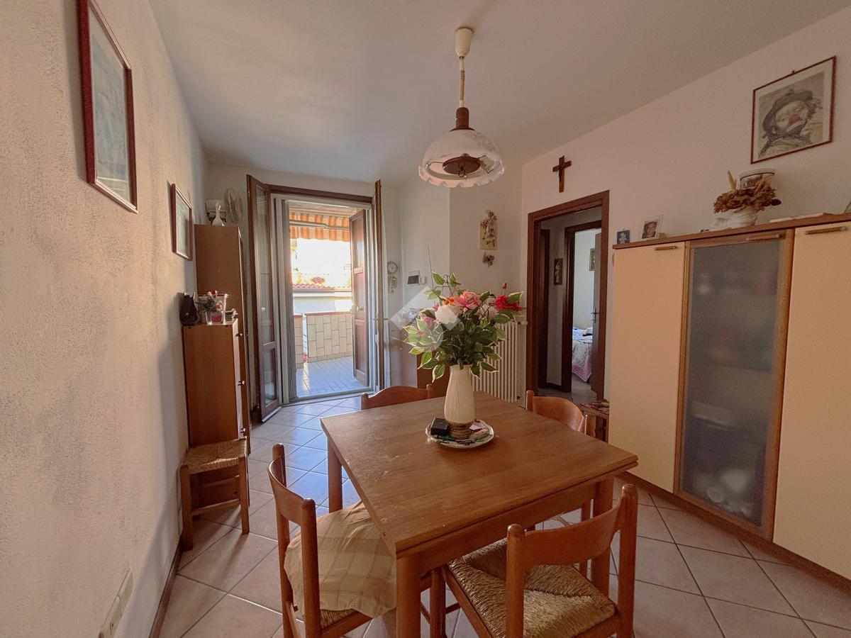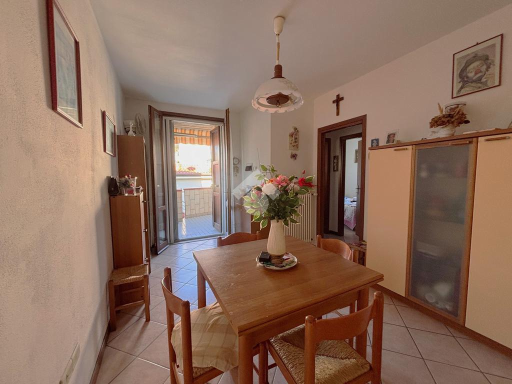 Dalla corte privata, una scala esterna ci conduce al balcone del primo piano, dove è situato l'ingresso dell' appartamento che si apre sulla zona giorno, composta da soggiorno con cucina a vista.