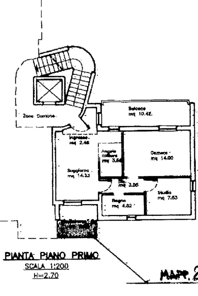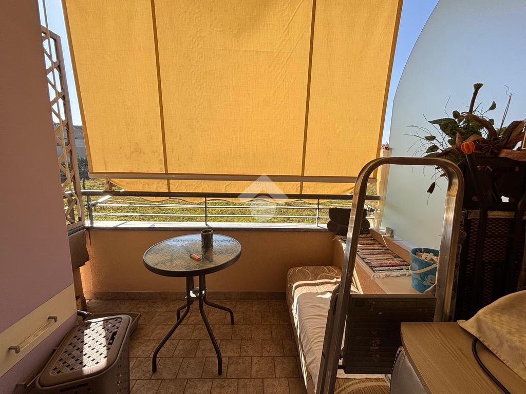 L ingresso si apre sulla zona giorno, composta da un luminoso soggiorno con angolo cottura, servito da due balconi abitaili dotati di tende da sole.