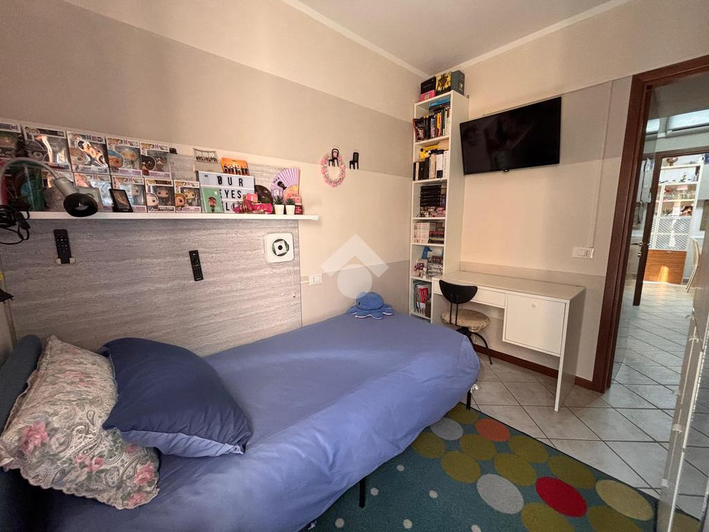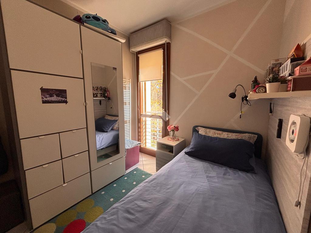 Un comodo disimpegno ci conduce nella zona notte ben separata per garantire privacy, che comprende una camera da letto matrimoniale ampia con affaccio su un balcone, una cameretta singola con portafinestra e parapetto e un bagno finestrato con vasca/box doccia.